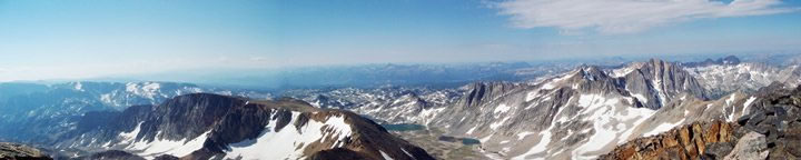 A three-shot panorama looking south and west from the summit of Granite Peak. The Sky Top Lakes are in the middle of the picture, to the right of them are two tarns, and above the tarns is a double peak called the Spires.