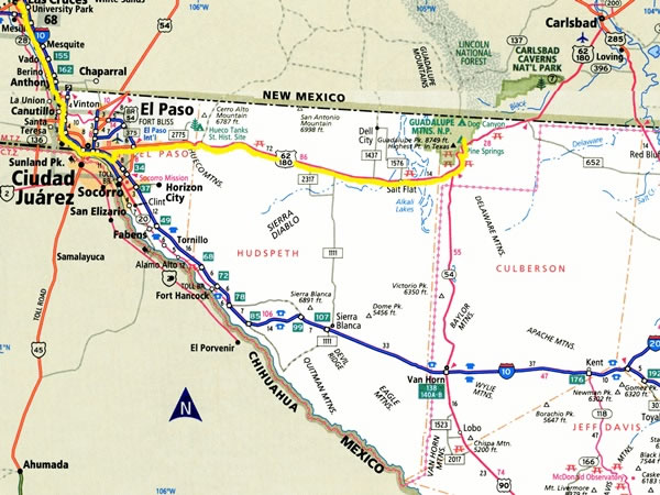 On Sunday, 2 October 2016, however, it was time to hit the road again. I left Albuquerque, New Mexico, and drove south to Texas on the I-25 US interstate highway, which – just south of University Park, New Mexico – melds into the I-10 interstate highway. To get to Guadalupe Peak, I continued driving on the I-10 as far as the Ramada Inn on the eastern outskirts of El Paso, where I spent the night. Then, on Monday morning, 3 October 2016, I drove north on Lee Trevino Drive as far as US federal highway 62/180, where I turned right and headed east along US-62/180 to the Guadalupe Mountains National Park. |