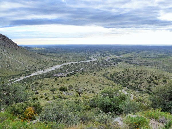 Looking back down at the campground and trailhead (near the left-hand circle) and at the Guadalupe Mountains National Park’s visitors’ centre (near the right-hand circle), and at US highway 62/180 in the middle distance. |