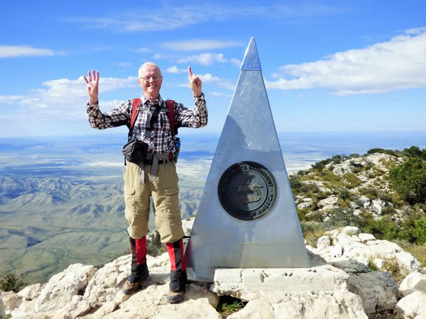 At the top of Guadalupe Peak, I am indicating it was the 41st US state highpoint I’d either climbed or visited. Guadalupe Peak – the highest mountain in Texas – is 8,751 feet / 2,667 metres above sea-level, and is the 14th highest of the fifty US state highpoints. |