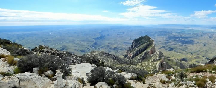 A panoramic photograph looking south from the summit of Guadalupe Peak. The prominent prow-like peak below the summit of Guadalupe Peak is El Capitan (8,085 feet / 2,464 metres) – not to be confused with the El Capitan at Yosemite if only for the fact that the rock on the El Capitan in Texas is, to quote Douglas Butler’s book, A Walk Atop America, “eroding, easily dislodged limestone, making rock climbing impractical and dangerous.” |