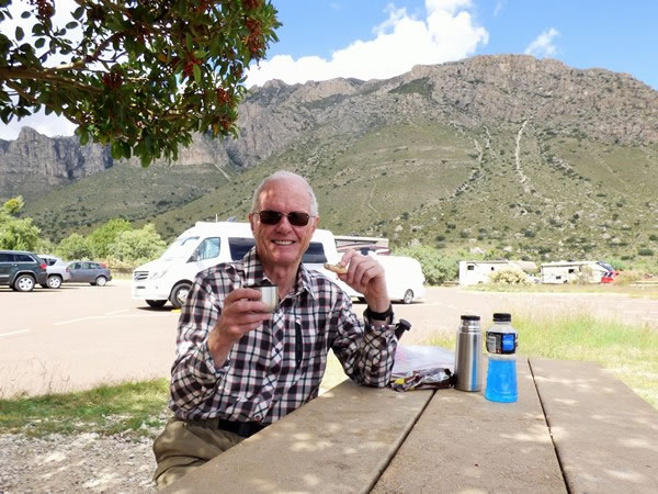 With Hunter Peak as a backdrop, I sat at a picnic table under the shade of a tree in the trailhead parking lot and enjoyed lunch and a thermos of coffee. Climbing Guadalupe Peak – my 41st US state highpoint – had been an especially enjoyable experience. (This is the last picture in this album.) |
