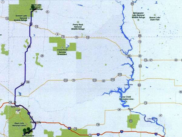 On Tuesday morning, 6 August 2013, John Fitch and I climbed North Dakota’s highpoint, White Butte, (which is marked “A” near the top left-hand corner of this map). In the afternoon, we drove via US highway 85 to South Dakota, and then continued on US highways 85, I-90 and 16 to Mt Rushmore (“B” on this map). Finally, we drove late at night from Mt Rushmore to Sylvan Lake Lodge in the Custer State Park (which is marked “C” in the bottom left-hand corner of this map). |