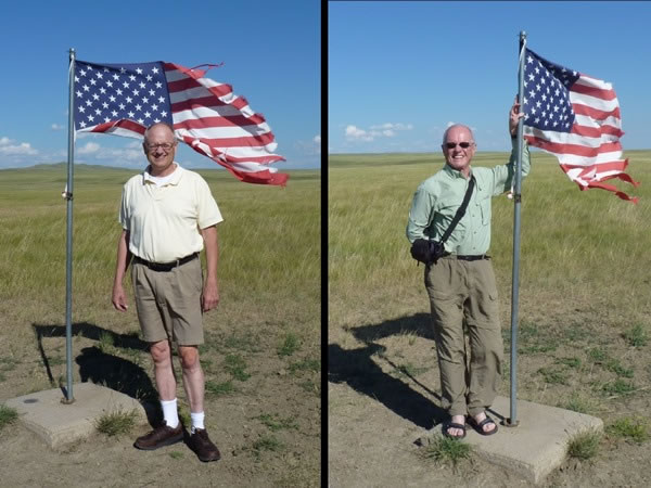 John Fitch (left) and Nigel Roberts standing alongside the geographic centre of the United States. A June 2008 article in the New York Times accurately describes how one gets to this spot: “You slip through barbed wire and follow a worn path toward the flag, past dandelions and wildflowers sprouting from the scrub, with nothing before you but sky, pasture and a solitary flag.” |