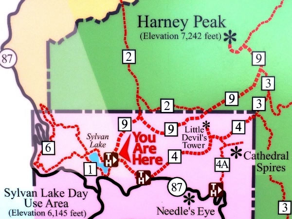 This map at the trailhead shows where we went. From the trailhead (marked “You Are Here”) we followed trail number 9 to the summit of Harney Peak. On our way down, we branched off trail number 9 and took trails 3 and 4 back to Sylvan Lake. |