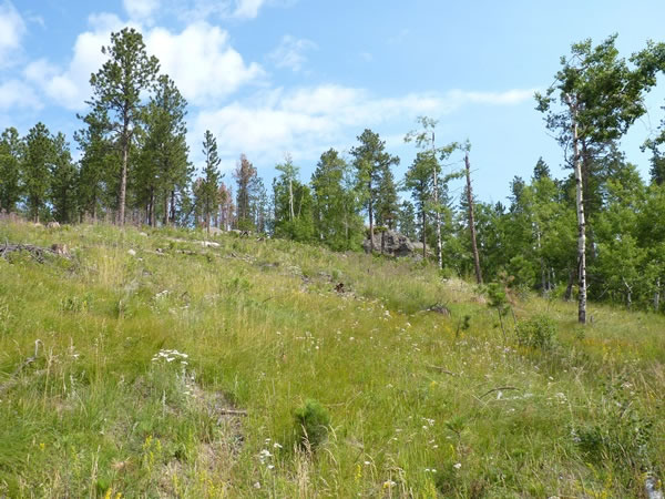 Looking across a clearing dotted with flowers towards pine and birch trees. The white flowers in the foreground are …