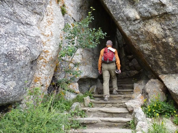 John took this photograph of me going up the steps and between the rocks that constitute the entrance to Harney Peak’s summit pinnacle.