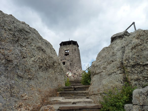 ... the forest fire watchtower on the summit of Harney Peak. The lookout tower was built by the Civilian Conservation Corps in 1939. We reached the summit of Harney Peak at 11:35 am, exactly two hours after we’d set off from the Sylvan Lake trailhead. |