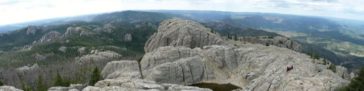 A three-shot panoramic view looking south-west from the summit of Harney Peak. In the foreground in the middle of the picture is the dam that was built by the Civilian Conservation Corps in 1939. Behind it, in the middle distance, is the large granite dome that’s probably the highest accessible natural point in South Dakota as a result of the fact that a watchtower now sits on Harney Peak’s summit. |