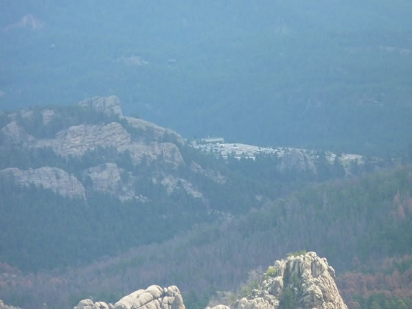 ... Mt Rushmore (some of the complex’s car parks are clearly visible near the centre of this telephoto that was taken looking east from the watchtower on the summit of Harney Peak).