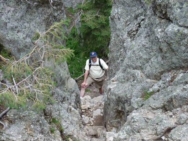 Parts of the approach to Little Devils Tower were fairly steep. In this photo, John’s pondering whether or not to climb up this gully. He did …