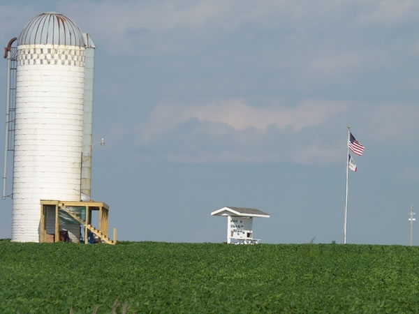 A telephone picture taken from the side of Iowa state highway 60, looking across soybean fields and at Hawkeye Point, Iowa’s highpoint.