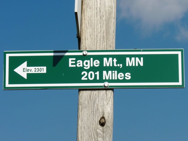 ... this sign – one of 49 signs behind the Iowa highpoint that point towards and name the highpoints in the other states. John quickly realised that there’s an error on this signpost. As the crow flies, it’s about 400 miles – not 201 miles – from Hawkeye Point, Iowa, to Eagle Mountain, Minnesota.