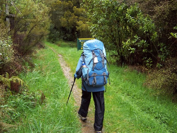 Heather and I left Brown Hut at 2:10 pm. The Department of Conservation notice that’s obscured by Heather’s pack said “The Heaphy Track is a walking track only. Mountain biking is not permitted on this track.” Nowadays, however, mountain bikers are permitted to cycle the track between 1 May to 30 November. |