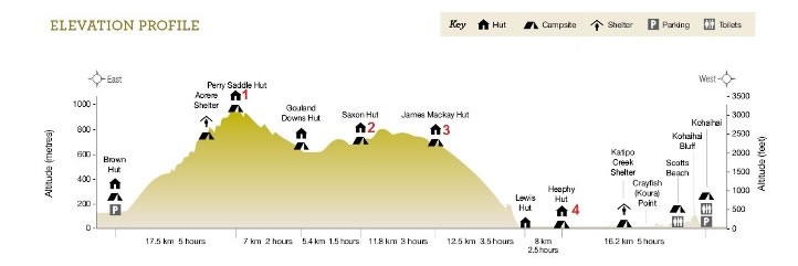 … as this elevation profile shows, Heather and I had to do almost all the climbing that’s involved in an east-west Heaphy Track hike on our first afternoon on the track.