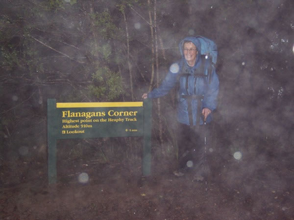 At 6:35 pm, we reached Flanagans Corner (910 metres / 2,985 feet), the highest point on the Heaphy Track. Not surprisingly, Heather and I decided not to take the five-minute detour to the lookout!
