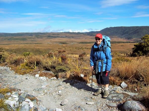 An hour after we left the Perry Saddle Hut, I took this photograph of Heather and of the Gouland Downs behind her. Red tussock dominates the landscape.