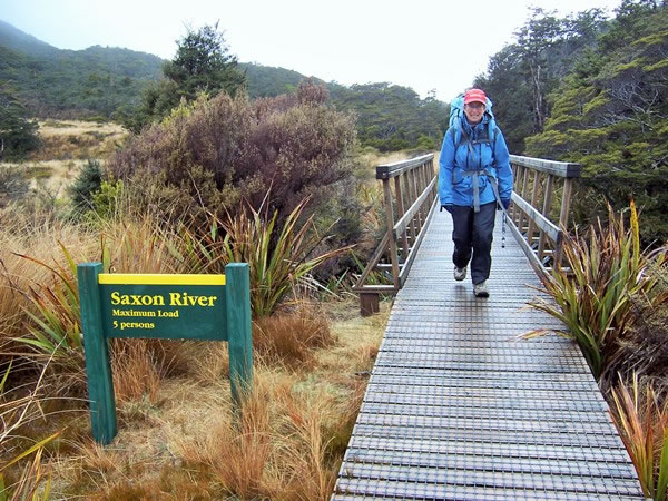 Dressed in our wet-weather gear, Heather and I left Saxon Hut at 9:20 am, and ten minutes later crossed the river that gives the hut its name.