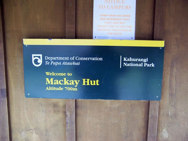 The Mackay Hut – 700 metres / 2,296 feet above sea-level – has both a modern-style Department of Conservation nameplate and …