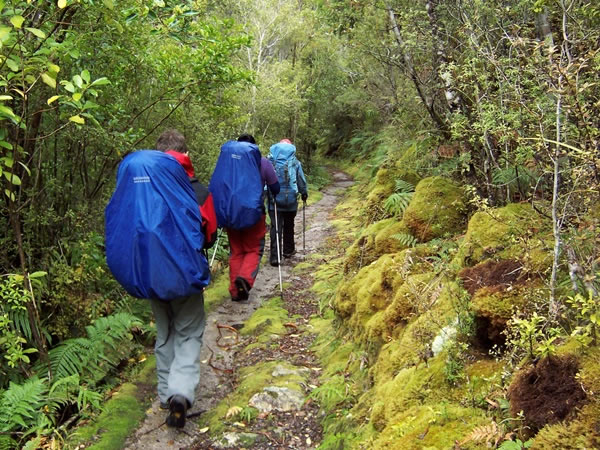 A rear view of Malcolm, Millie, and Heather heading west down the Heaphy Track. Note that whereas Malcolm and Millie sensibly had pack-covers, Heather and I somewhat stupidly didn’t. We learnt our lesson, though, and when Heather and I walked the Camino de Santiago the following year, we made sure we had them then. |