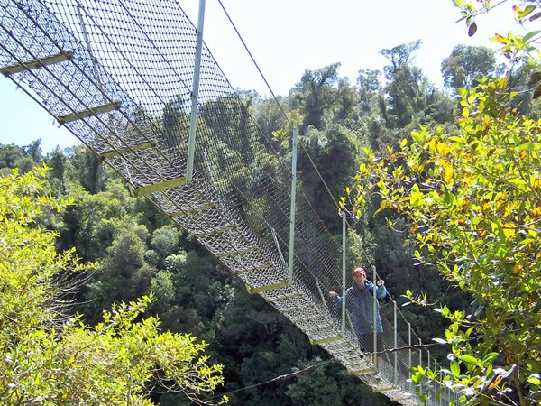 Shortly after leaving the Lewis Hut, Heather started out across a long wire swing-bridge over the Heaphy river.