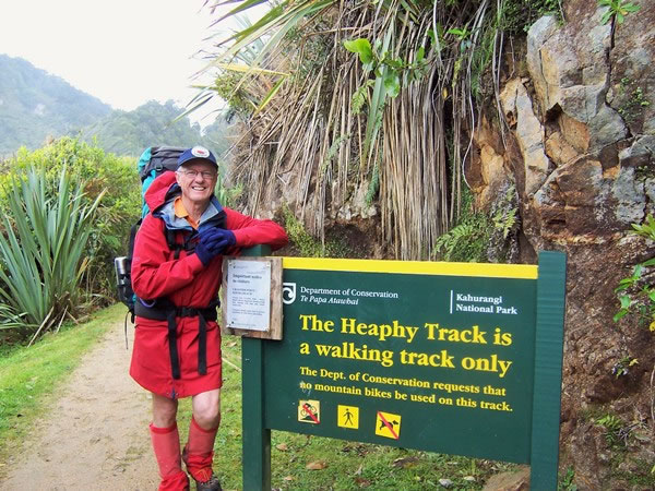 … Heather took this photograph of me at the end of the track. Our final day’s walk – from the Heaphy Trampers Hut to Kohaihai – was 16.2 kilometres / 10.0 miles long, and it took us a tad more than five-and-a-quarter hours. The Heaphy Track is the longest walk in the pantheon of New Zealand Great Walks (only the Whanganui river canoe trip is longer); during our five days on the track, we had covered a total of 78.4 kilometres / 48.7 miles. |