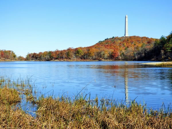 Looking across Lake Marcia (the beach is on the right) and up towards the New Jersey High Point monument, which was surrounded by some splendid fall colours.