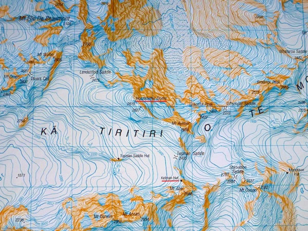 Our base for the week was Kelman Hut, which I’ve underlined in red on this map. It’s at the head of the Tasman glacier. Also underlined in red is Hochstetter Dome – our main climbing goal.