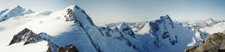 A panorama – “stitched” together from three photographs that I took during our first afternoon at Kelman Hut – of the view looking north from the hut. From left to right, the most prominent peaks are Hochstetter Dome’s eastern peak (2,827 metres / 9,275 feet), Mt Aylmer (2,699 metres / 8,855 feet), Graceful Peak (2,457 metres / 8,061 feet), Brodrick Peak (2,669 metres / 8,757 feet), and (in the distance, near the right-hand edge of the picture) Mt D’Archiac (2,875 metres / 9,432 feet). |