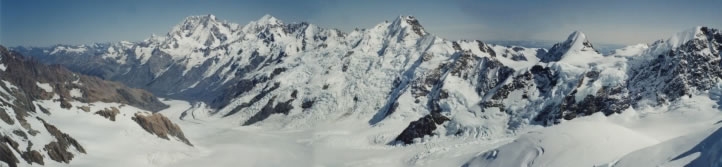 A three-shot panoramic photo-stitch of the view from the summit of Hochstetter Dome. From left to right, the most prominent peaks are Aoraki / Mt Cook (3,724 metres / 12,218 feet), Mt Tasman (3,497 metres / 11,473 feet), the Minarets (3,040 metres / 9,974 feet), and Mt Green (2,837 metres / 9,308 feet). |