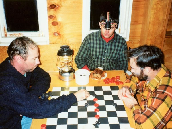 Geoff (left) and Dave playing a board game, while Rod watches them.