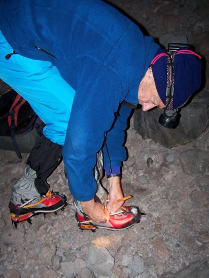First attempt: By 3:00 am on Tuesday, 26 June 2007, we were at about 9,000 feet / 2,750 metres above sea-level. The temperature was noticeably colder and the snow was considerably more icy, so we paused on a small patch of frozen scoria to put on our crampons. This is a picture of Eric tightening his crampon straps. |