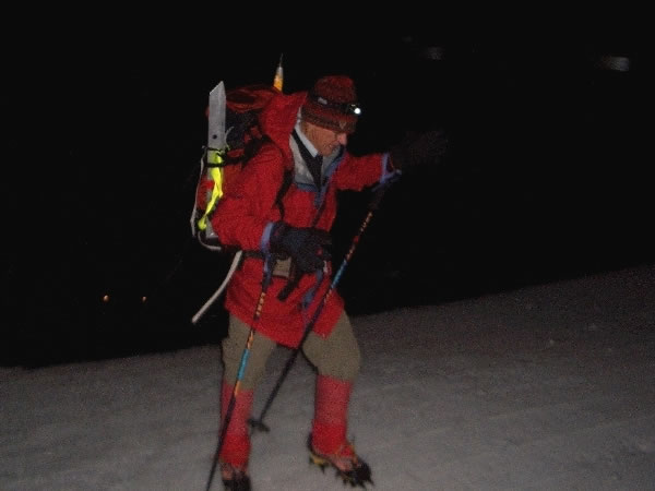 Eric took this picture of me starting off again at 2:08 am, heading up Mt Hood's lower slopes after putting on my crampons. As the photograph shows, the spikes of my crampon were barely penetrating the snow's hard crust.