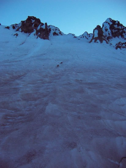 This photograph was taken at 5:10 am, immediately after the previous picture, and is of the steep, icy slopes we had to ascend.
