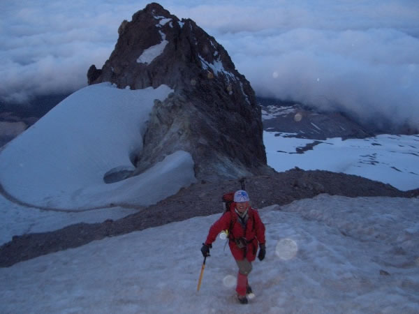 At 5:17 am, Eric took this picture of me on the lower portions of the final section of the south face of Mt Hood. Note that I'm now wearing my climbing helmet to protect my head either from ice falling down the slopes of the mountain or if I were to fall. |
