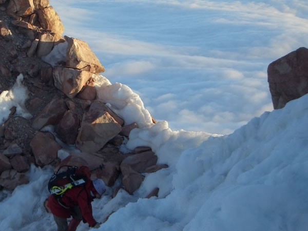 It took me only five minutes to reach Mt Hood's summit rim (which this photo, taken by Eric at 6:07 am, shows me doing).