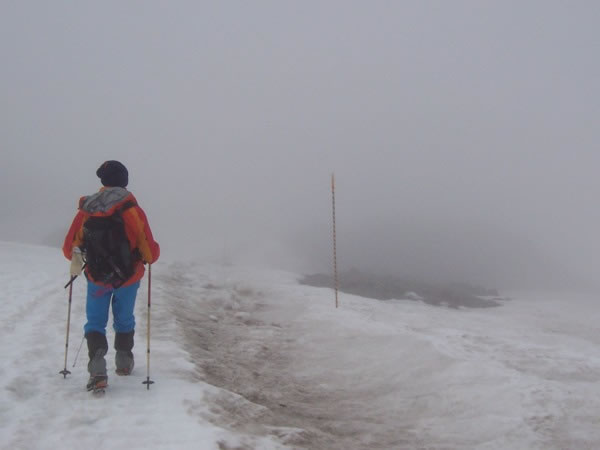 Half an hour later (at 9:10 am), Eric and I were in the clouds as we trudged slowly down the mountain: Eric's knees were sore; so was my toe.