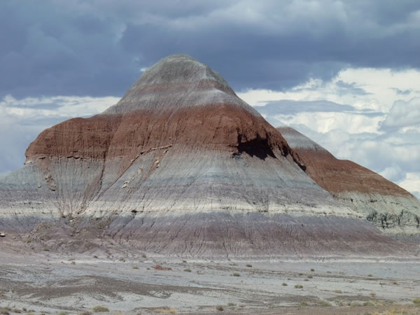 The white layer running through the lower third of this hill in the Tepees area of the painted desert consists of sandstone, while the dark reddish-brown layer has a high degree of carbon.