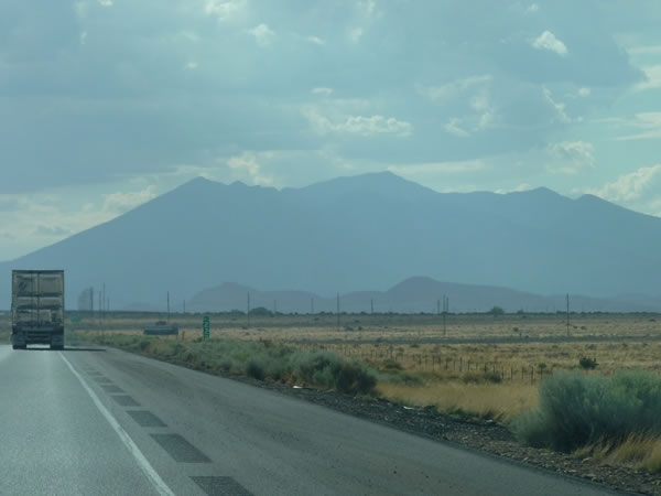 ![]() As we neared Flagstaff, San Francisco Mountain – a giant extinct volcano encompassing Agassiz Peak (on the left) and Humphreys Peak (in the centre of the picture) – loomed ever larger on the horizon. |