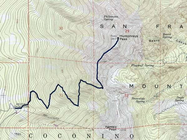 ![]() This photograph (which is of a part of the USGS’s map of the Humphreys Peak area) gives a rough indication of the route we took to climb Humphreys Peak. After a five-minute walk across a meadow, hikers enter the Coconino National Forest and then climb – via a series of long switchbacks (or zig-zags) – to the rim of the former San Francisco volcano, which is at roughly 12,000 feet / 3,650 metres above sea-level. Climbers then turn north and, by and large, follow the crater rim ridge-line to the summit of the peak. |