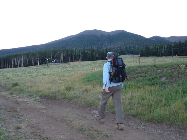 ![]() Eric setting out across the meadow (which I assume is the end of an Arizona Snowbowl ski-field run) at the start of our hike. The Humphreys Trail starts at 9,500 feet / 2,896 metres above sea-level, so we had 3,133 feet / 955 metres and 4.8 miles still to go to reach the summit. |