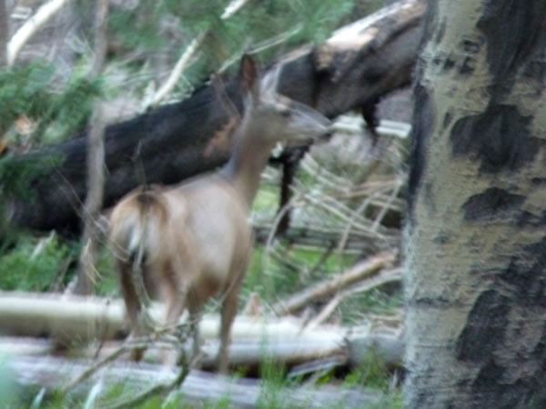 ![]() Shortly after six o’clock we were thrilled to see this mule deer in the forest. She quickly moved away, making it particularly difficult to photograph her in the early morning light. Nevertheless, despite its poor quality, it’s still worthwhile including this picture in this album in an attempt to convey some of the magic of the moment. |