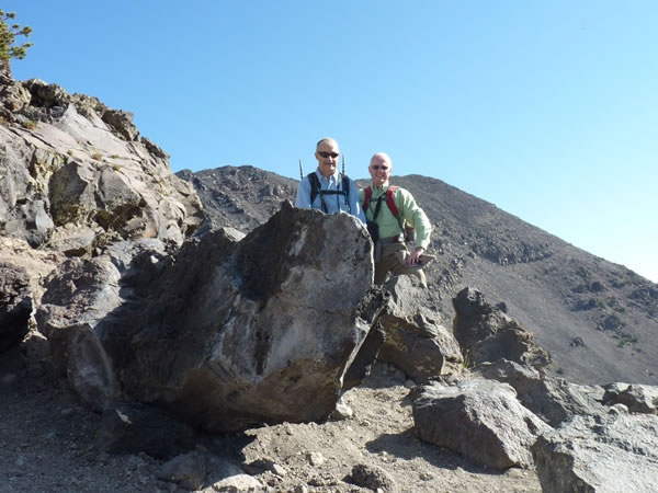 Once again, I balanced my camera on a rock and took a photograph of Eric and me, with the ridge-line we had to traverse to get to the summit of Humphreys Peak visible behind us.