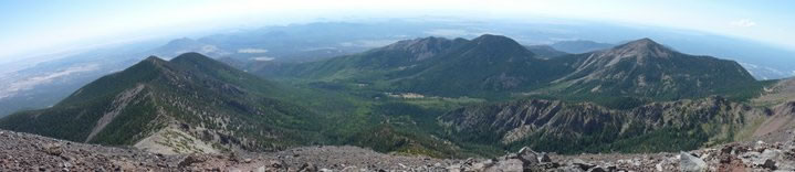This is a three-shot panoramic photo looking east from the summit of Humphreys Peak and down into what was formerly the crater of the San Francisco volcano.