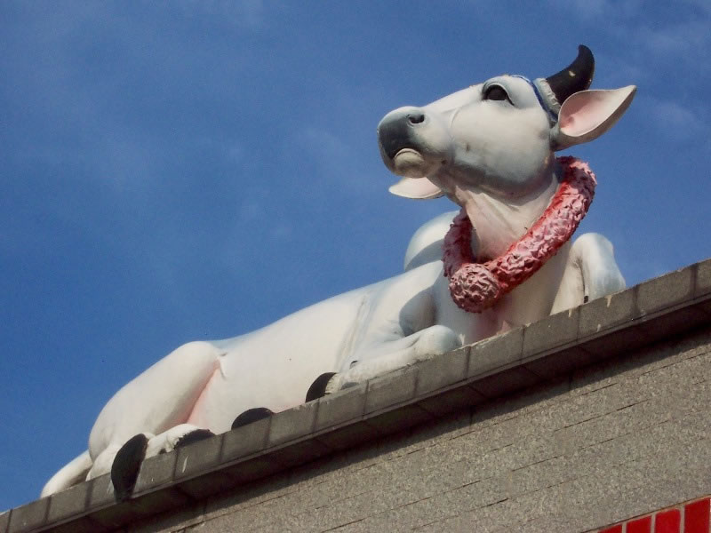 This photograph of a larger-than-life cow atop a Hindu temple was taken on 19 April 2006.