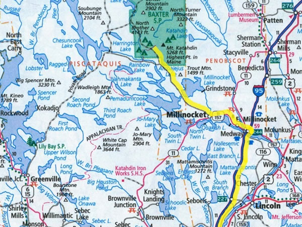 Near Augusta (the state’s capital), I turned onto US interstate highway 95 and drove north on it for 135 miles / 217 kilometres before heading east on Maine state route 157 to Millinocket, which was my base for climbing Mt Katahdin. The following day – Friday, 30 August 2013 – I drove from Millinocket to the Baxter State Park. |