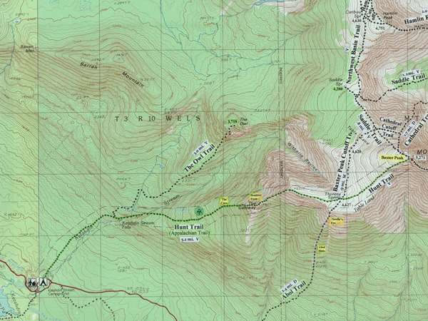 This is a photograph of part of the map I bought for climbing Mt Katahdin. To reach the summit of the mountain from the Katahdin Steam trailhead, one heads predominantly east along what’s known as the Hunt Trail, which – depending on your perspective – is also either the first or the final portion of the Appalachian Trail, because Baxter Peak (which is what the summit of Mt Katahdin is called) is the northern terminus of the Appalachian Trail. It’s 5.2 miles / 8.4 kilometres from the trailhead to the top of Katahdin, and the “V” on the map beneath the words” Appalachian Trail” is there because the trail is rated “Very difficult. Rugged and steep. May be dangerous.” |