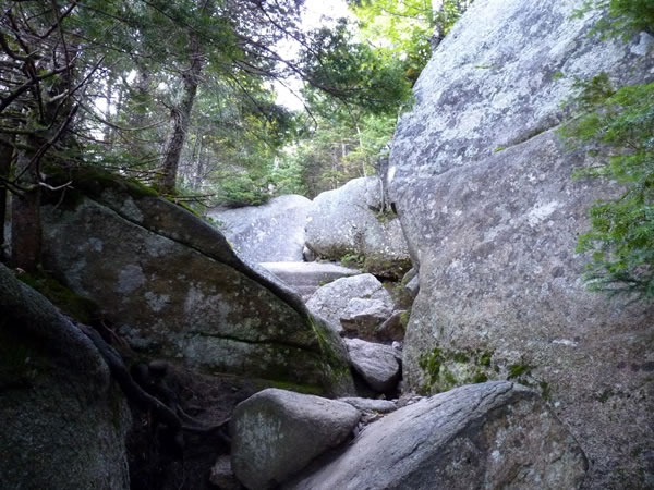 The Hunt Trail / Appalachian Trail passes through, around, and over some very large boulders.