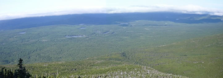 When I reached the tree-line, I paused to take another two-shot panoramic photo, this time looking west across the forests and lakes that lie beneath Mt Katahdin. (Incidentally, the lakes in the area are all called ponds.)