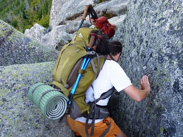 In their chapter on Mt Katahdin, Charlie and Diane Winger say, “Imagine traversing the boulder field with a full back pack!” Well, this picture is designed to help those who have difficulty imagining it!